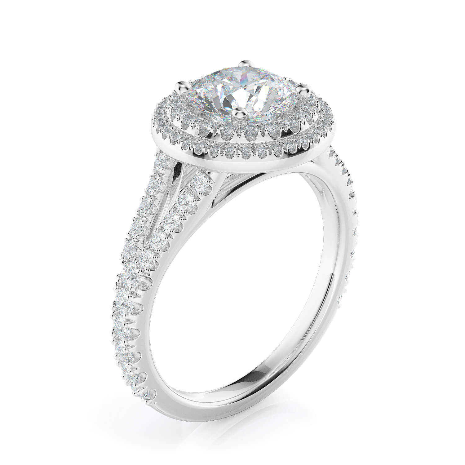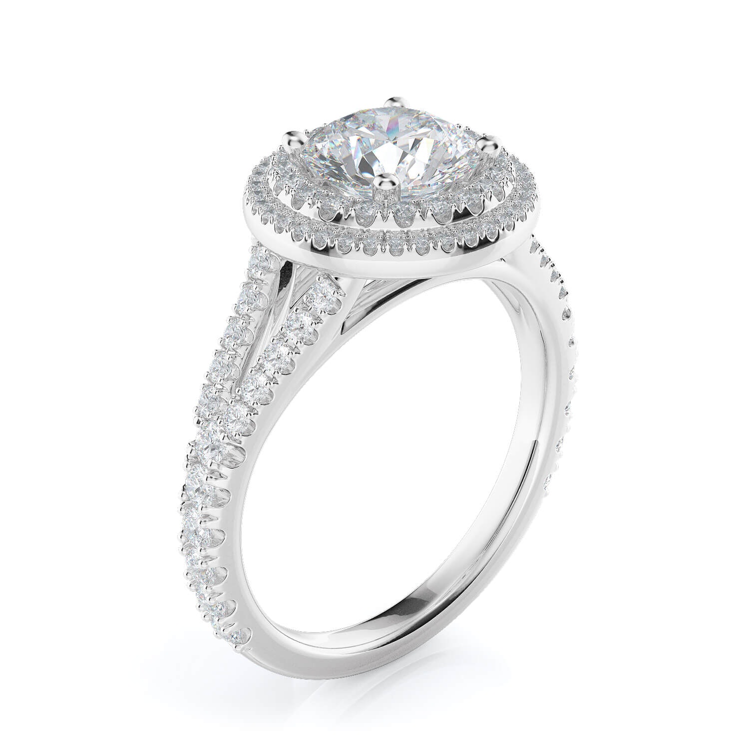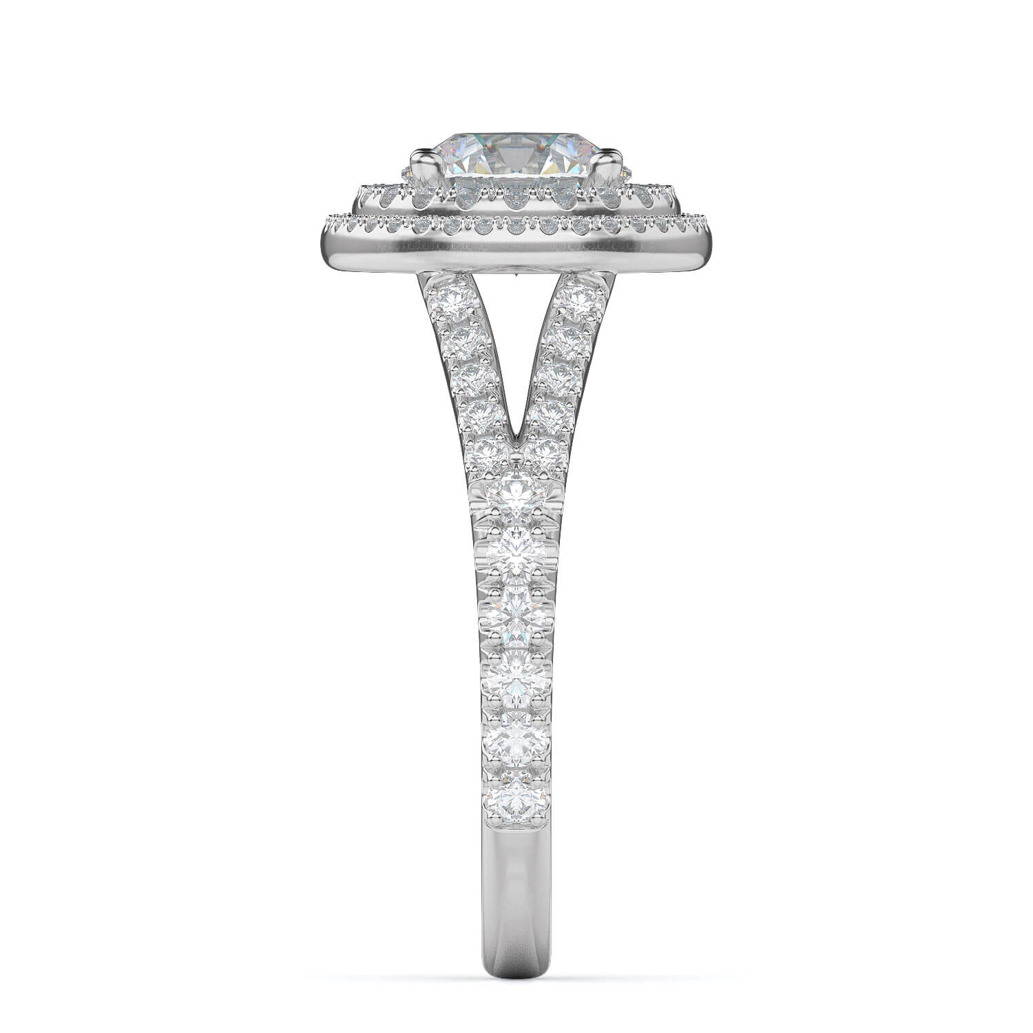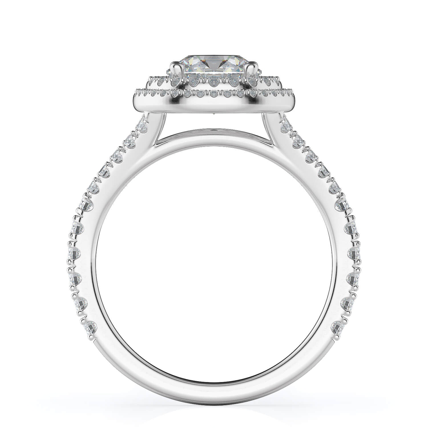 Designed to dazzle, the Dione setting pairs a bold round halo with a double row of pavé-set diamonds along the band, delivering brilliance from every angle. The elevated setting allows light to flood the centre stone, maximising its sparkle while the intricate under-gallery adds a refined finishing touch.