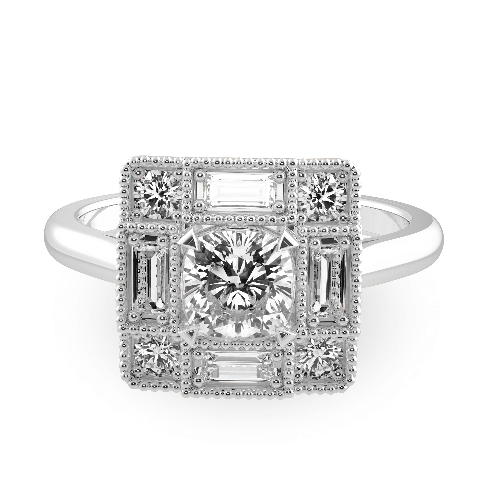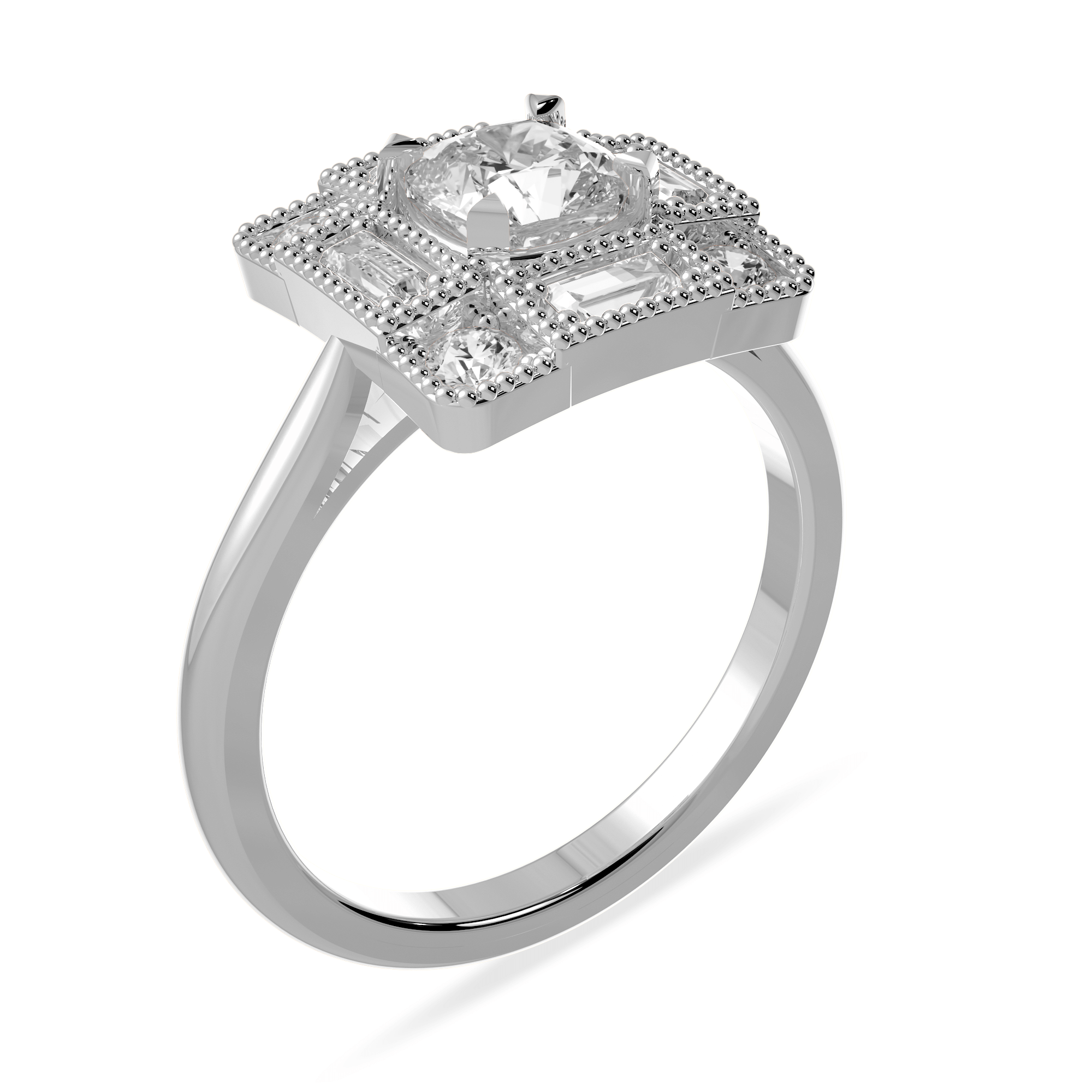 Price is for setting only.Art-deco Cushion cut halo set with baguettes and round brilliant cuts.